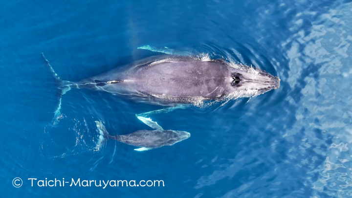 ベタ凪の海を泳ぐザトウの親子🐳